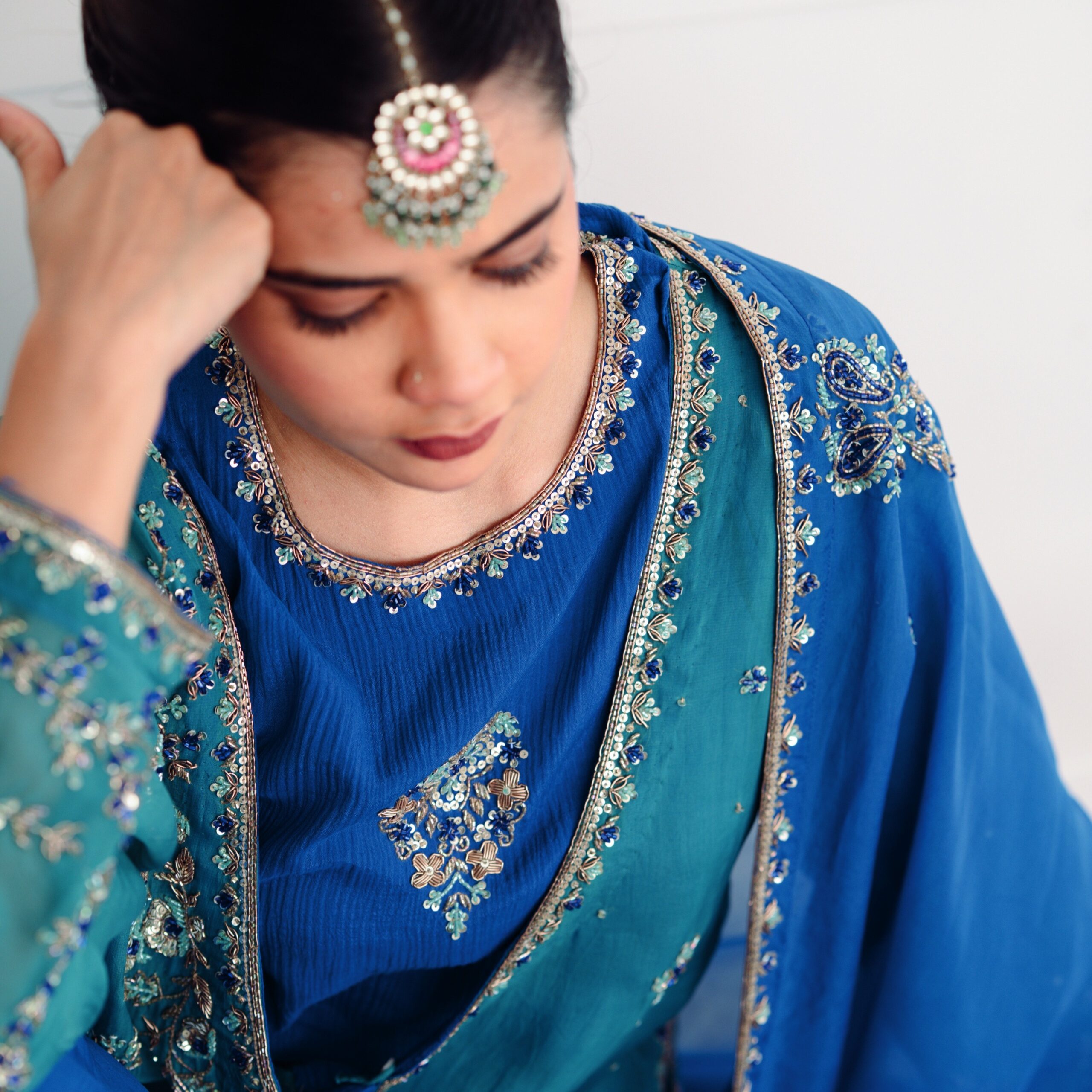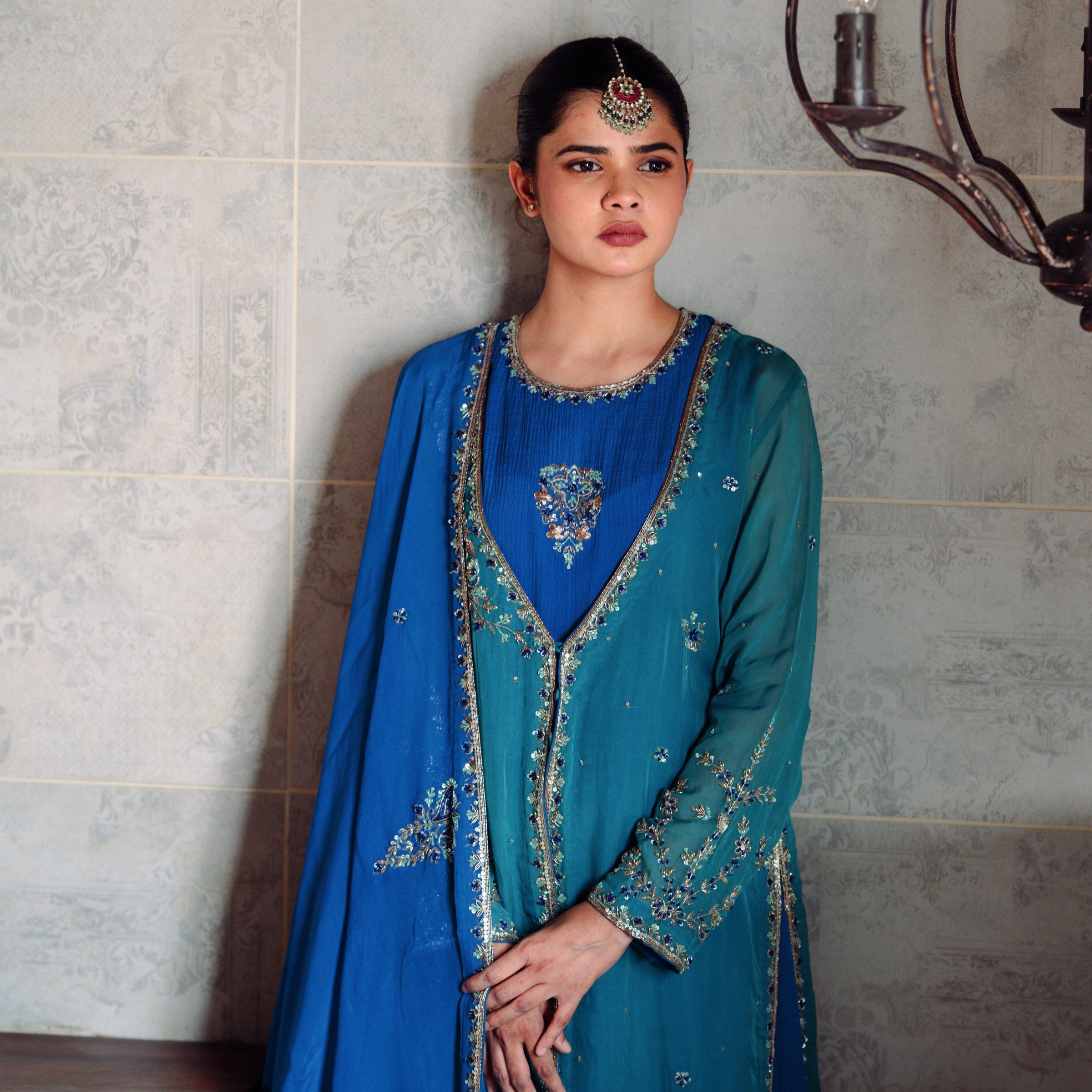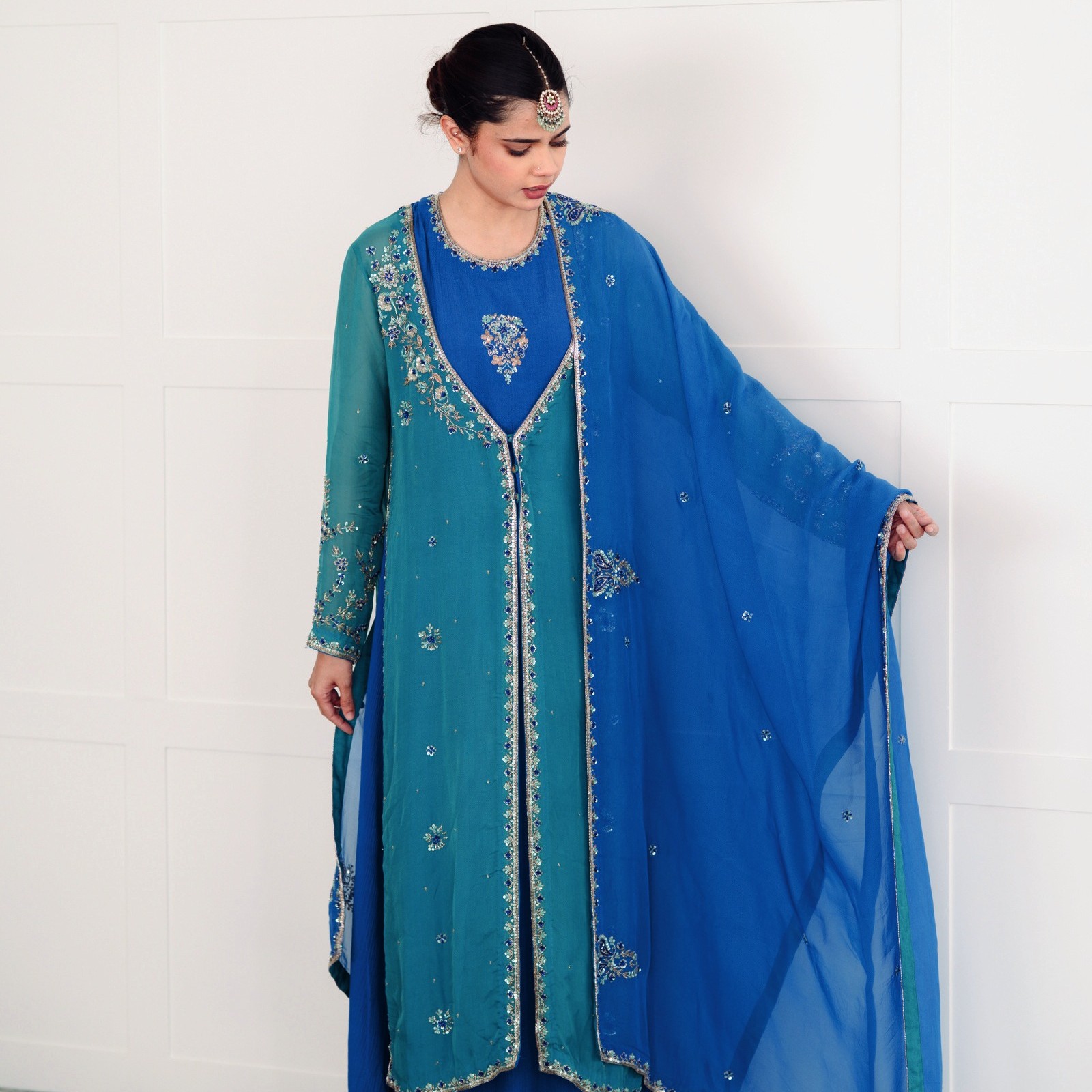 FABRIC DETAILS : Top : satin crush cotton Coat : Soft Organza shawl : soft organza