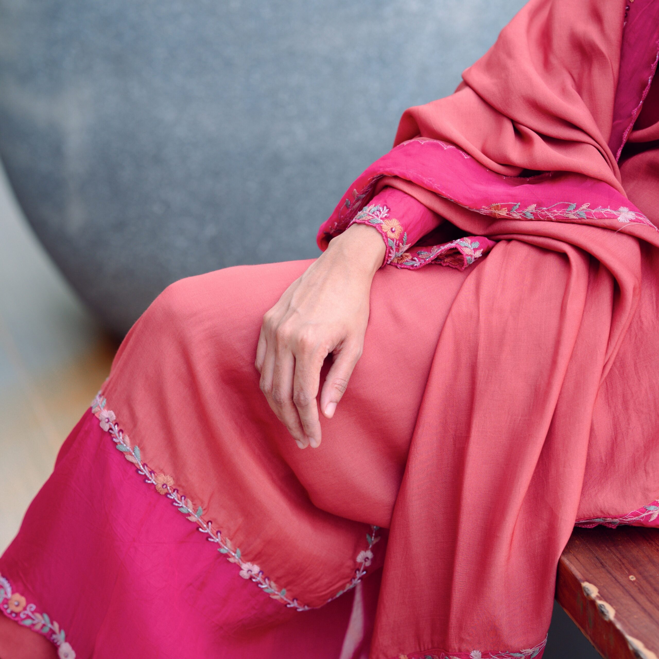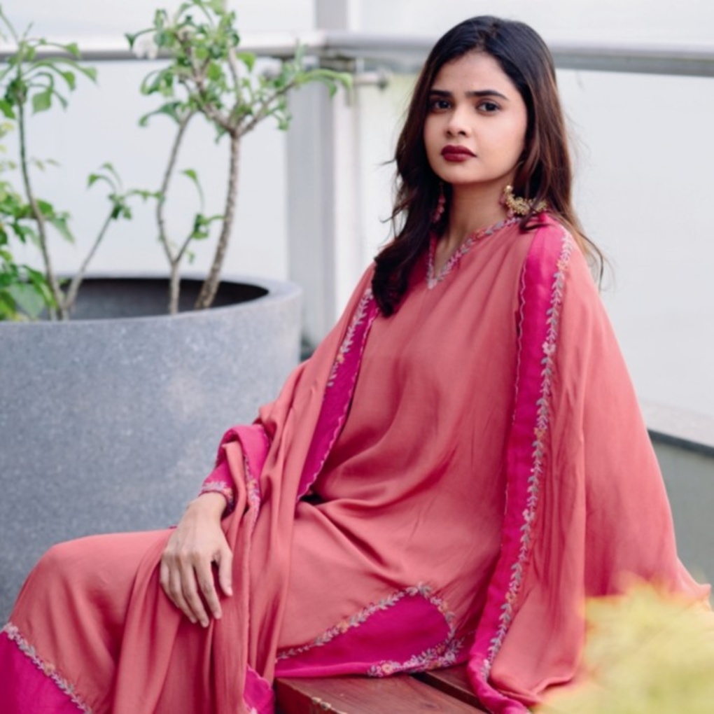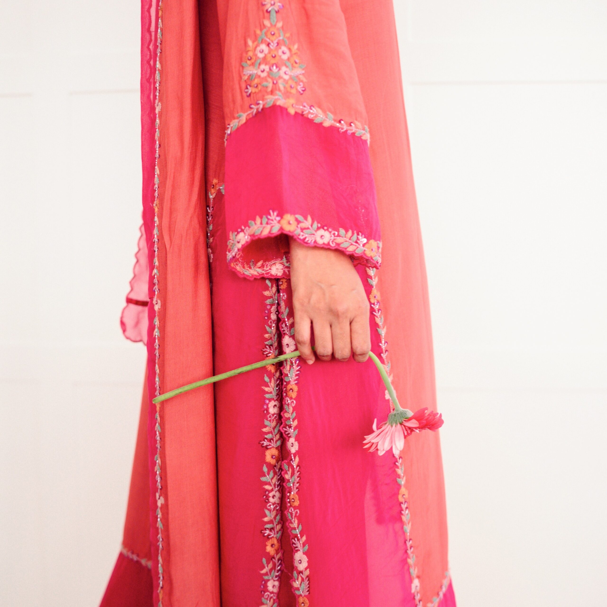 FABRIC DETAILS : Top : muslin with soft organza details Shawl : muslin with soft organza details Pant : santhoon